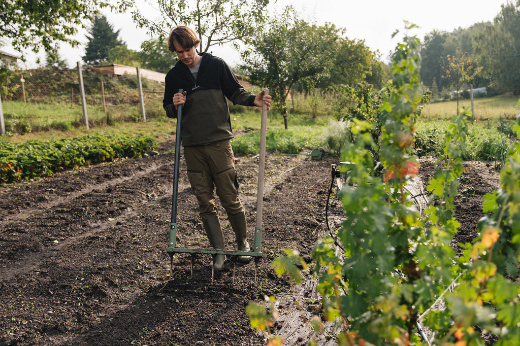 Broadfork u nás na farmě používáme před každým výsevem nebo výsadbou. Hroty se zaryjí co nejhlouběji do země a pohybem dozadu se s broadforkem zakýve. Tím se půda trochu nadzvedne.